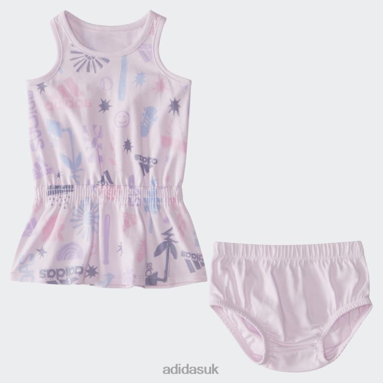 When you’re this new, the best day ever involves a pine cone and a couple of spoons. Suit them up to explore in this infants’ adidas dress and bloomer set. The sleeveless tank dress has a flouncy skirt and a sporty print. Bloomers with an elastic waist and legs keep them covered as they tip and tumble.Our cotton products support more sustainable cotton farming.